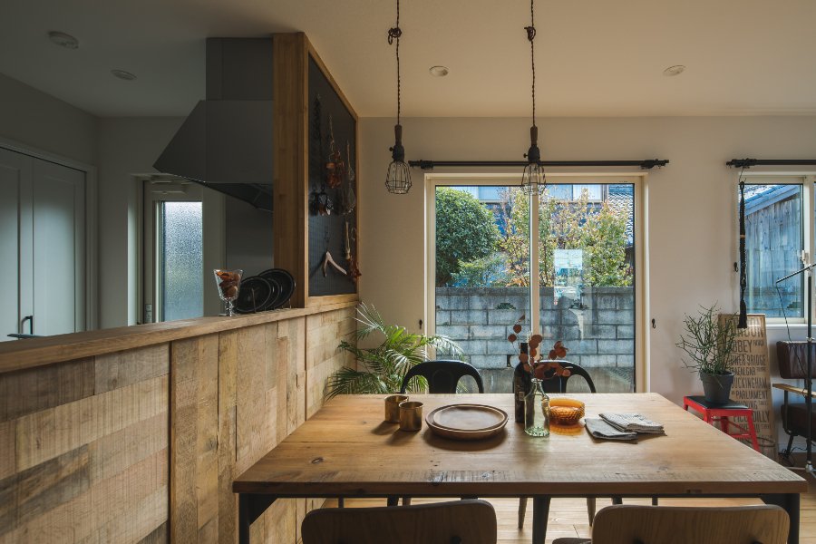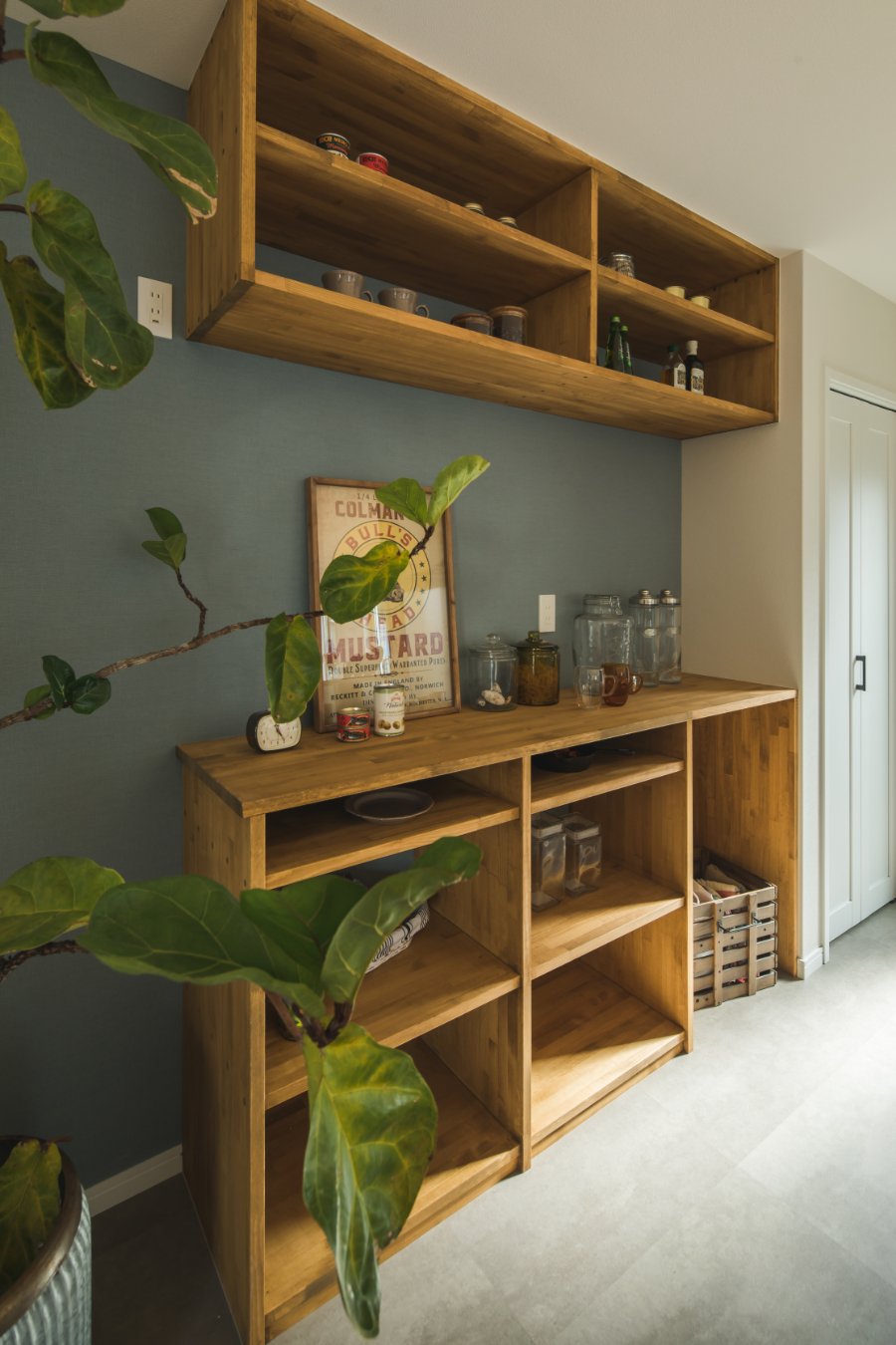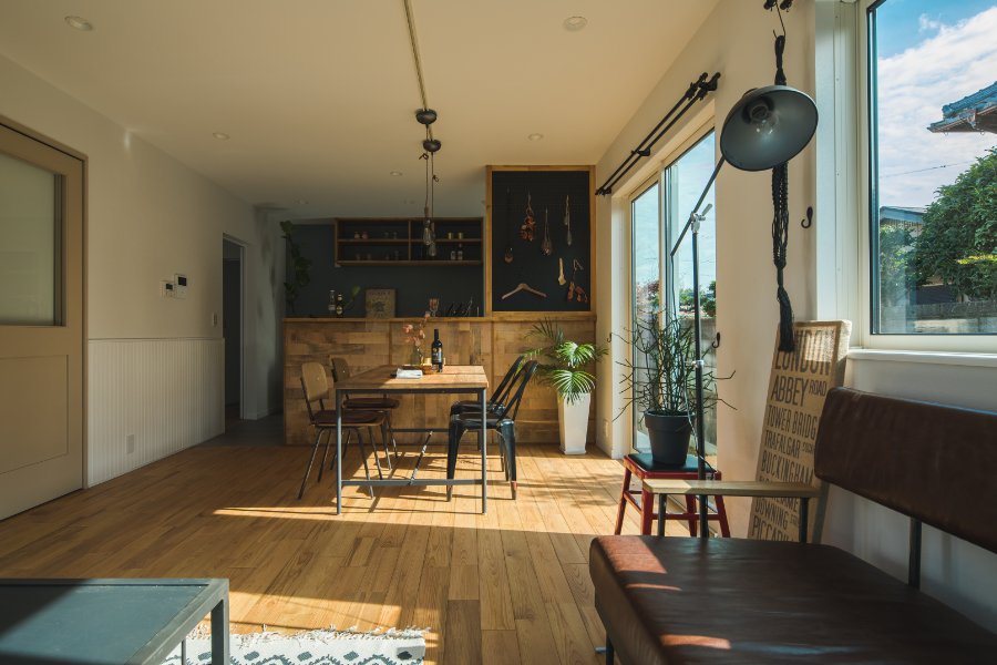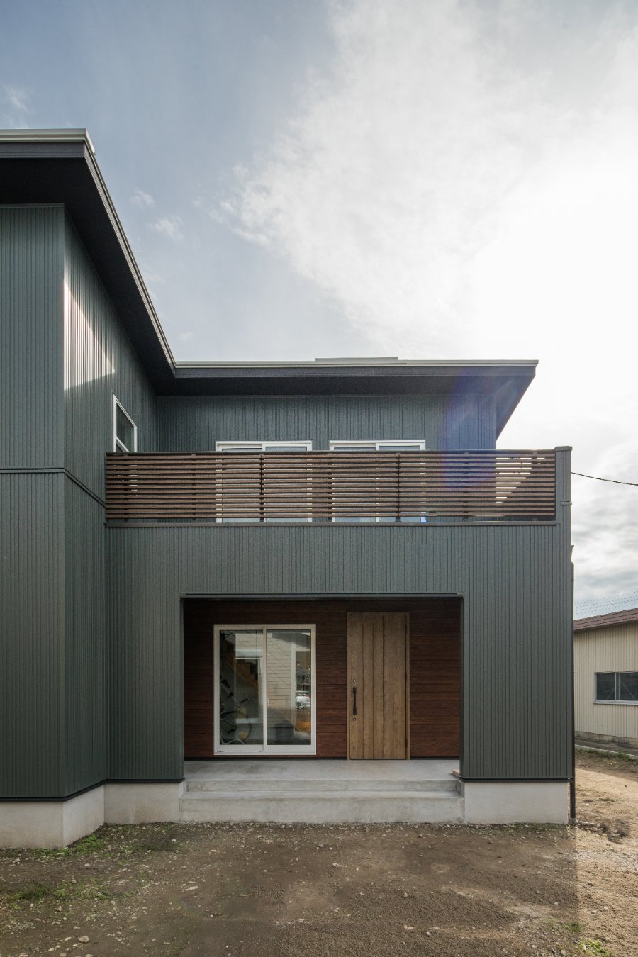 ポーチリビングがあるブルーのカリフォルニアスタイルの家