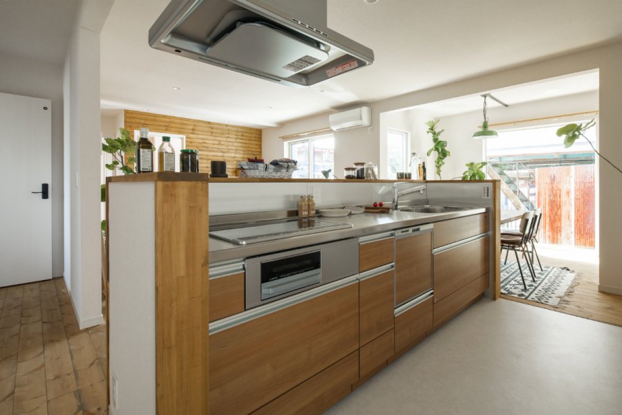 ポーチリビングがあるブルーのカリフォルニアスタイルの家